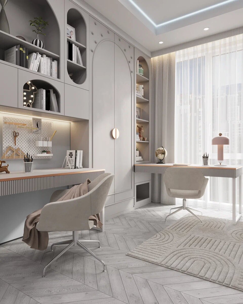 • Индивидуальные светильники для чтения и подсветка рабочих зон. У девочки мы сделали элегантную арку с подсветкой, создающую уютный кокон, а у мальчика – стильную настольную лампу, дополняющую его зону. Несмотря на общую гармонию, удалось подчеркнут