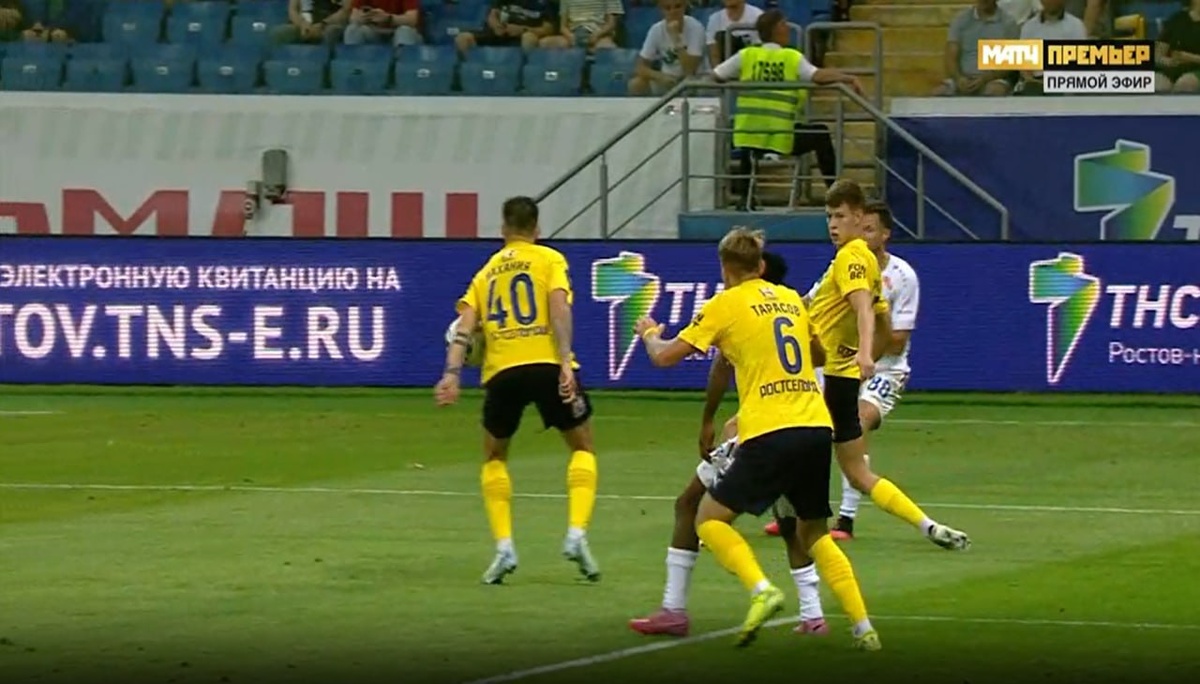 Ростов-Пари НН 32 мин. Правильное решение принимает Цыганок и продолжает игру. Мяч попадает игроку №40 команды Ростов в руку которая находится в естественном положении и не увеличивает площадь тела. Правильное решение: Продолжить игру