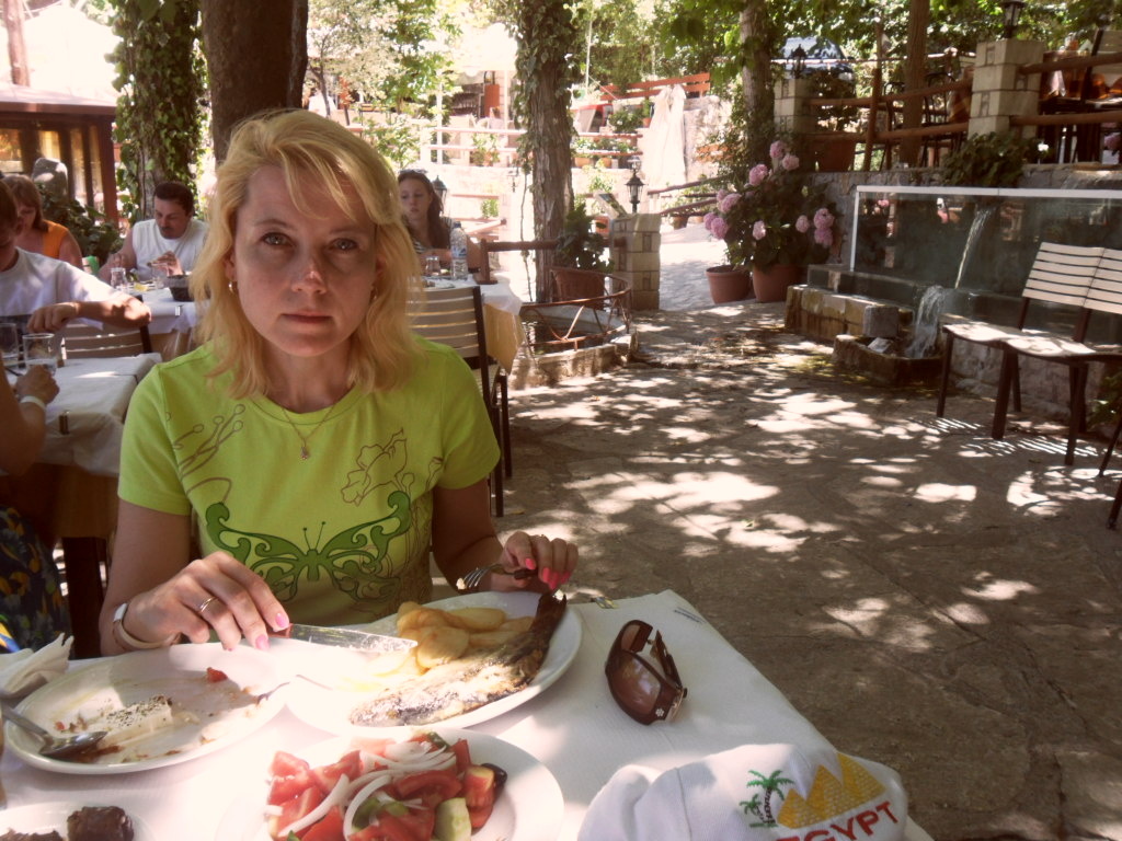 Мы на севере Крита. У нас обед в замечательном ресторане - здесь три яруса, на первом - журчащие водопады, в мини-бассейнах плещется живая речная форель, которую запекут на гриле по вашему заказу. Такую вкусную форель подают ещё разве что в Турции, в других странах - традиционные блюда в ресторане уже будут иными. После жаркой экскурсии здесь прохладно, журчит вода, очень приятно гулять и отдыхать. Водопады низвергаются прямо в аквариумы с живой рыбой: А это сам мангал для гриля: Это наш замечательный обед, большие порции, очень вкусно. Кушаем мы на 2-ом ярусе горного ресторана. Поднимаемся на 3-ий ярус горного ресторана, здесь очень красиво: Небольшое плато на 3-ем ярусе, на нём - тоже вода: И снова - замечательные водопады: Такую красоту надо обязательно запечатлеть на память о Крите: Нам пора ехать дальше. Нас ждёт восхитительное озеро Курнос, на котором живут 400-килограммовые черепахи. Здесь мы снова насладимся живописной природой Крита, а в озере после такой жаркой экск