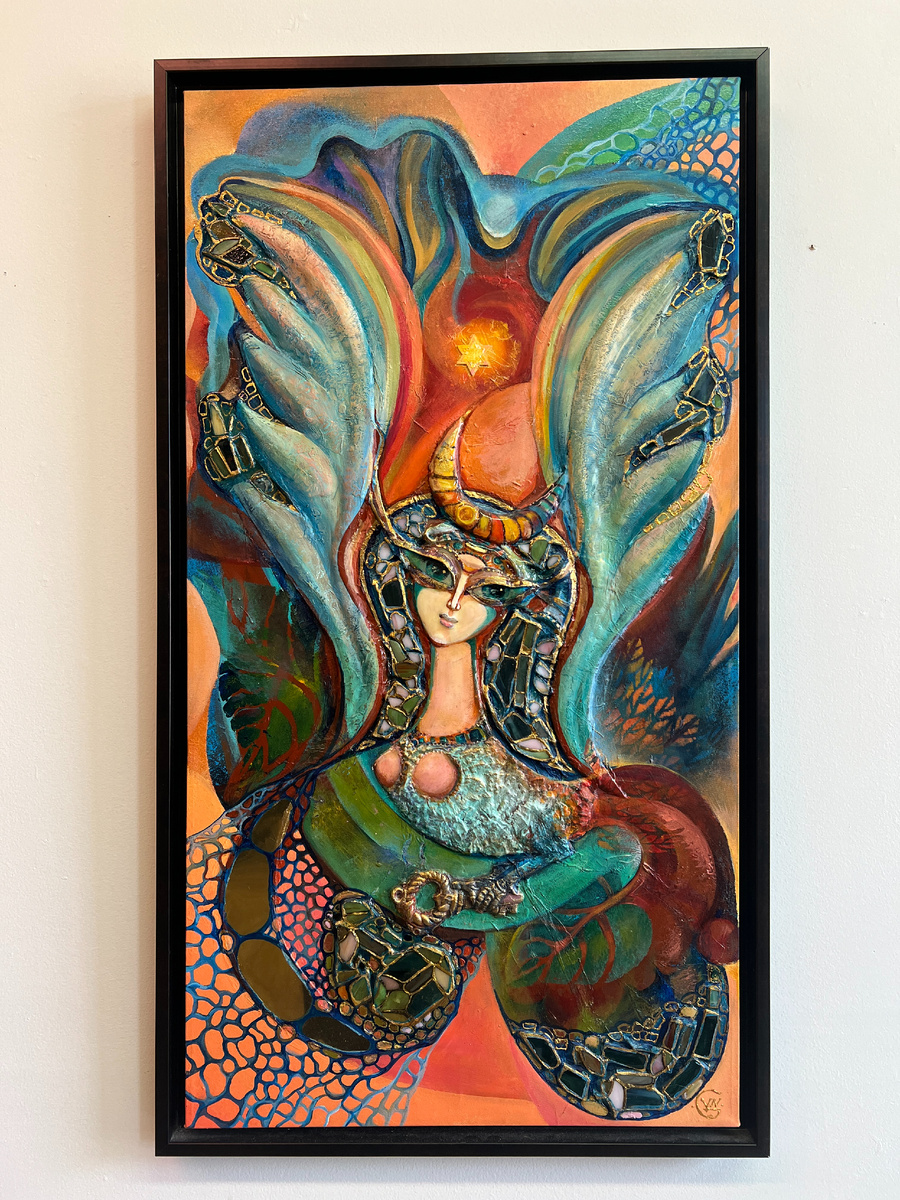 В центре — птица Гамаюн, древняя пророчица славянской мифологии, вестница богов, воплощающая знание, духовную память и связь миров. Но в этой экспозиции она получает новое измерение — как образ Ариэля и Израиля, как символ единства народов Евразии, их культурной преемственности и метафизической миссии. Ариэль, Израиль и Гамаюн: три грани одной истины Ариэль — в древнееврейской традиции «Лев Божий», защитник, мудрый ангел и символ Иерусалима. В тюркско-монгольской культуре — «страна истинных мужчин», носителей воли и духа— союз мужского начала (Ар) и божественной земли (Эль).
