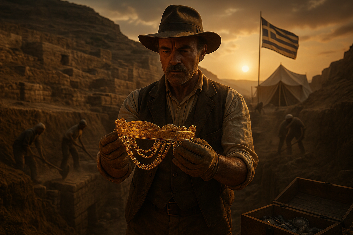 Символ явился весной 1873-го. «Большой медный предмет, блестящий, как золото», — так он описал то, что увидел в стенке траншеи. Рабочих он отправил в перерыв, сам вырезал «окно» в грунте и достал серебряный сосуд, ломившийся от украшений. В нём оказалось — по его счёту — десять тысяч предметов: от золотых ланцюгов до бусин, от фибул до великолепной диадемы. Так был рождён «клад Приама» — тот самый, которым позже сфотографируют Софию: юная гречанка, светящееся золото на висках, образ, за которым до сих пор спорит историческая совесть.