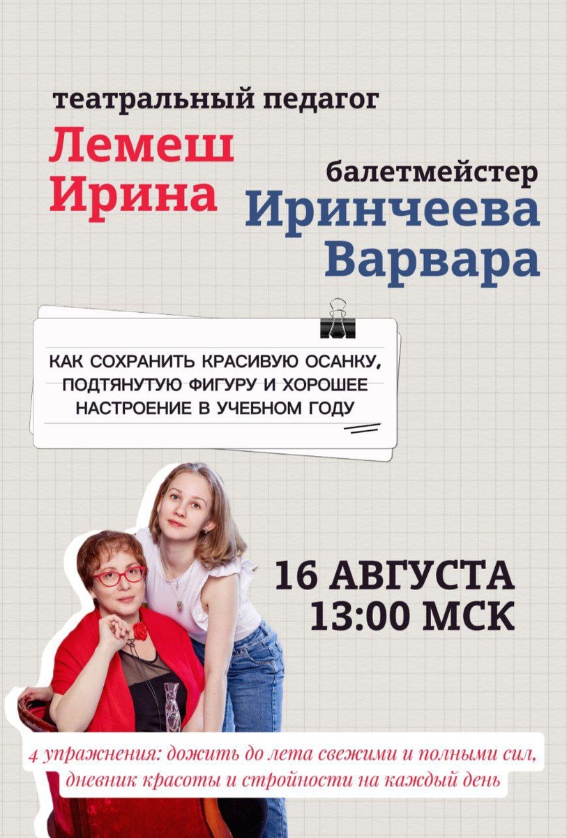 Когда я готовила программу, то искала не просто спикеров, а тех, кто несет в себе настоящую магию, кто может донести до нас что-то действительно ценное и красивое. Представляю вам Ирину Лемеш и Варвару Иринчееву – дуэт, который вдохновляет! Ирина Лемеш – театральный педагог и режиссер музыкального театра, автор книги «Лидочкин декабрь. Волшебные снежинки, театр и мечты». Варвара Иринчеева – выпускница легендарной Академии Русского Балета имени Вагановой, балетмейстер-постановщик и артистка балета. Вместе они ведут уникальный проект «Танцемания» Мы с вами, родители, постоянно ищем те самые "волшебные таблетки" для наших детей, особенно когда речь идет о здоровье, осанке, подтянутой фигуре и, конечно, о хорошем настроении, которое так важно в новом учебном году. На своем эфире Варвара и Ирина разберут все эти "таблетки" под микроскопом! ❤ Мы узнаем: — Что на самом деле работает, а что просто красивая реклама, когда дело касается здоровья опорно-двигательного аппарата. — Действит