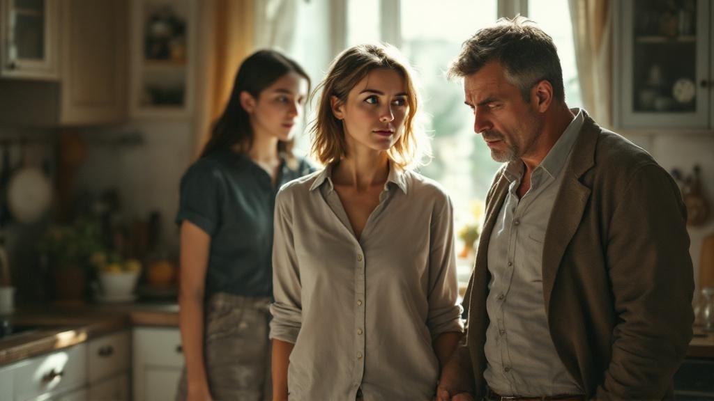 Девушка остановилась рядом с матерью, глядя на отца и незнакомую женщину.