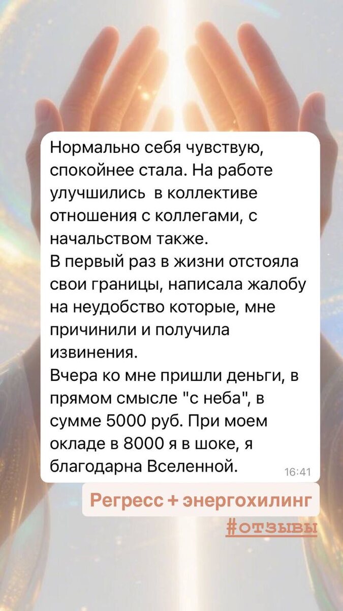 Благодарю за ваши отзывы✨ Как радостно наблюдать такие быстрые позитивные изменения в ваших жизнях. А ведь изначально было совершенно непонятно почему повторяются проблемы в отношениях с коллегами, в чем корень финансовых трудностей и низкой самооценки. Одна сессия регресса и все ответы получены. Очищены родовые ветки, добавлены энергии уверенности, повышены вибрации, открылись новые дороги, гармонизировались отношения, усилилась интуиция. В добрый путь ✨