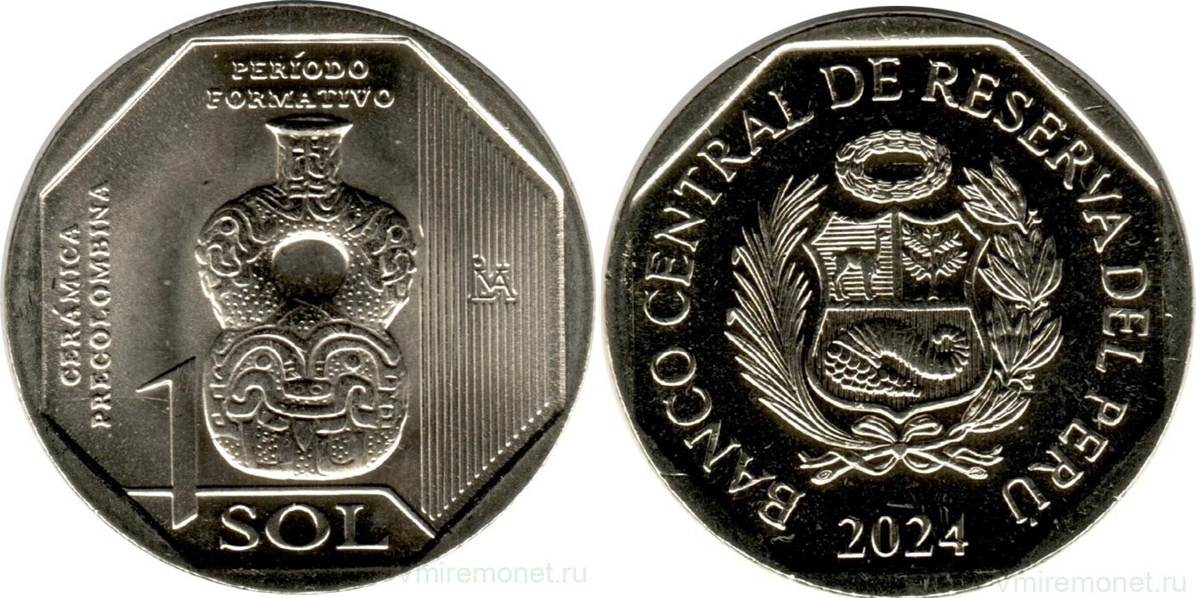 В последний раз мы обращались к юбилейке Перу, когда писали о серии, посвященной 200-летию независимости республики А ведь на смену ей пришла интересная серия, рассказывающая о керамики доколумбового периода. Перуанской керамикой древних цивилизаций вдохновлялись многие художники и керамисты, в том числе сам Поль Гоген. Всего в коллекции будет выпущено 11 монет номиналом 1 соль; на сегодня их уже три. Первая монета, появившаяся в прошлом году, посвящена «периоду формирования» - стадии развития археологических культур в Южной Америки. На ней изображен сосуд чавинской культуры, существовавший с 900 по 200 годы до н. э. на северных нагорьях Анд. За причудливыми линиями в нижней части мы можем рассмотреть чье-то улыбающееся лицо. Подробнее о монете Следующая монета представляет керамику культуры Моче (с I по VII век, побережье Перу), славящаяся своей антропоморфностью. Глиняные изделия выполнены в форме довольно реалистичных голов, персонажей или даже целых бытовых сценок. Благодаря ей м
