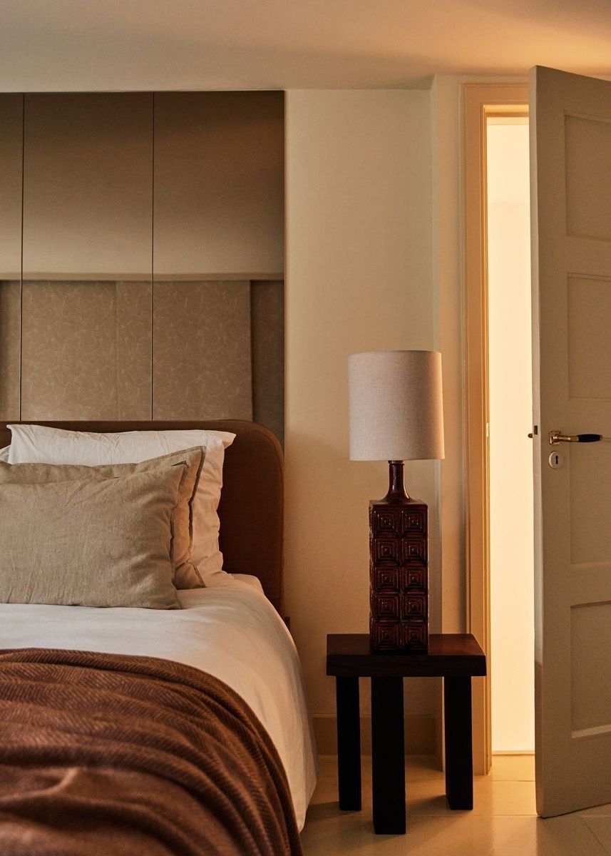 Зеркало за изголовьем кровати: благодаря тонированному стеклу прекрасно вписывается в остальную цветовую гамму спальни.