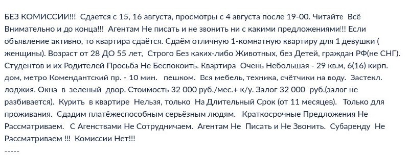 современные требования к арендаторам: - девушка - принципиально, чтобы жила ОДНА - возраст 28-55 лет - без животных - без детей - гражданин РФ - не студент и не его родитель - срок от 11 месяцев - курить нельзя - только проживание, no тату-салон)