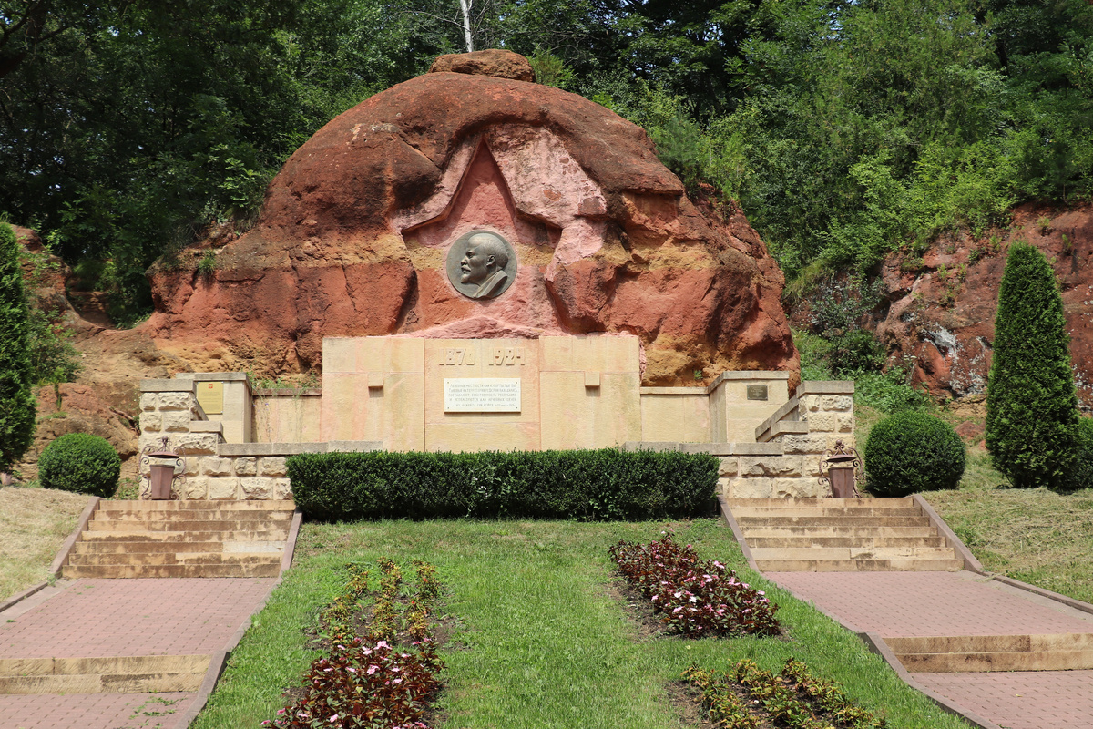 Гуляя по огромному парку Кисловодска, я, конечно же, не мог пройти мимо одного знаменитого места с одним из первых памятников вождю. Оказывается летом 1924 года, когда парк в Кисловодске еще не стал настолько большим, два студента Владимир Ингал, который в дальнейшем стал скульптором и будущий автор герба Азербайджанской ССР Рубен Шхиян вырубили на Красных камнях в Кисловодском парке довольно большой горельеф в виде головы Ленина. На Кавказских Минеральных водах на тот момент это был первый памятник вождю, да и вообще в СССР этот горельеф стал одним из первых памятников. Сохранились фотографии того, как студенты работали над этим памятником и как потом интересующиеся отдыхающие приходили посмотреть на художественную революционную работу в скале. Но в итоге сейчас этот памятник выглядит совершенно по-другому, а именно вот так: Почему? Да потому что студенты сделали горельеф в мягком песчанике. Мало того, что работа отличалась не самыми впечатляющими художественными качествами, так она е