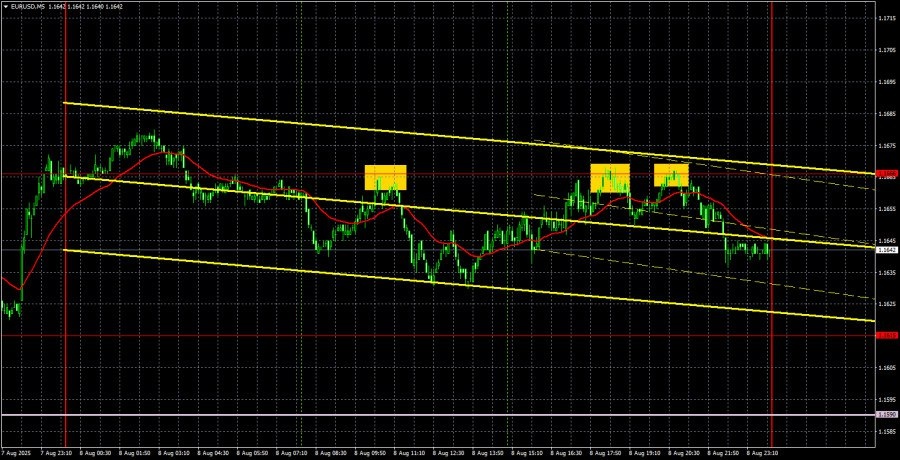 https://basechop.ru/wordpress/?p=53345 Анализ EUR/USD 5M. Валютная пара EUR/USD в течение пятницы торговалась исключительно вбок. Макроэкономический фон в этот день отсутствовал, а трейдеры решили выйти на выходные досрочно. Таким образом, и волатильность в пятницу была очень низкой. Так как движений на рынке практически не было, выяснять, что оказывало влияние на движение пары не имеет смысла – ничего. Вместе с тем, нельзя сказать, что фундаментальный фон в данное время отсутствует или слаб. На прошлой неделе сразу несколько представителей монетарного комитета ФРС высказались в пользу готовности к снижению ключевой ставки в сентябре. Теперь уже примерно половина Комитета открыто говорит о необходимости снижения ставки, чтобы оказать поддержку рынку труда. Члены FOMC сходятся во мнении, что давление на экономику из-за торговой войны Трампа оказывается более сильное, чем предполагалось, хоть ВВП во втором квартале и вырос гораздо сильнее оптимистичных прогнозов. Грядущее смягчение…