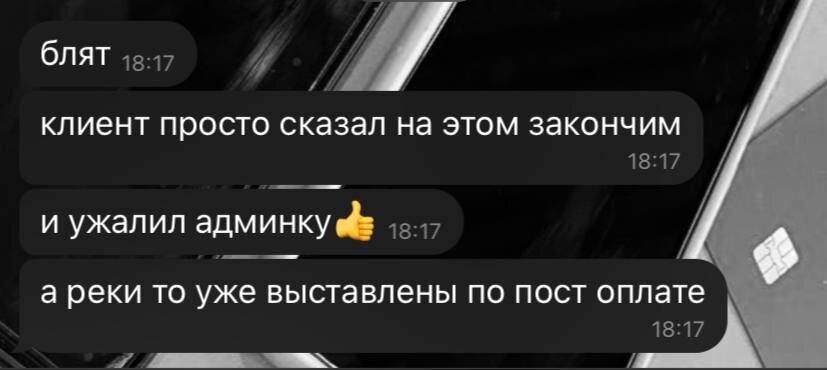 В работе с клиентами всегда есть риск: сегодня он просит залить канал, сделать креатив или настроить рекламу, а завтра… просто сливается и в чс. Мой совет: всегда берите предоплату. Даже если сумма небольшая, она защитит вас от двух проблем: 1. Потери времени. 2. Оплаты чужих косяков из своего кармана. 👉 Недавний случай Ко мне обратился клиент, хотел сделать закуп для канала по ставкам. Стартовый бюджет — $500. Мы всё согласовали, я взял небольшую предоплату, сделал креатив и договорился с каналами на оплату. На следующий день клиент пишет: «Я передумал», хотя заявки все равно идут. Без предоплаты мне пришлось бы платить админам из своего кармана, а так расходы закрылись, и репутация осталась чистой. Вывод: минимальная предоплата (хотя бы 50%) — фильтр от несерьёзных клиентов. Она экономит время, деньги и нервы. Бесплатный разбор и другие вопросы - @tg_mozart