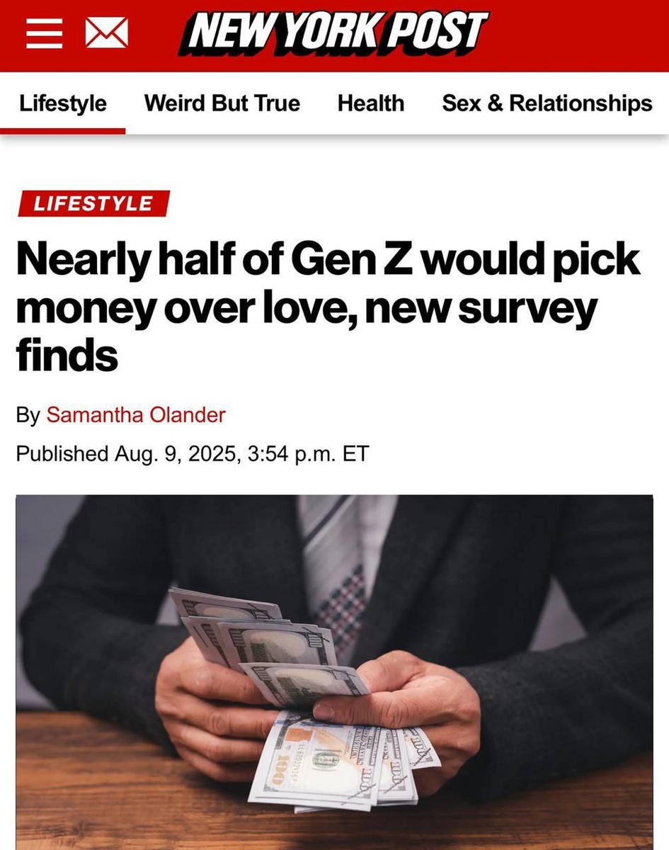Для зумеров деньги ВАЖНЕЕ, чем любовь — исследование. 46% респондентов признались, что хотят долгосрочную финансовую стабильность вместо романтических отношений. Если и заводить парня, то идеальный кандидат должен зарабатывать от $200 тысяч (около 16 млн рублей) в год. При этом большинство не согласились бы встречаться с парнем, у которого доход ниже $80 тысяч (6 млн рублей). Однако, каждая третья зумерша не скрывает, что сошлась бы с бывшим, если бы он внезапно разбогател 😦😦 Миллениалы — вы последняя надежда повышения уровня рождаемости.