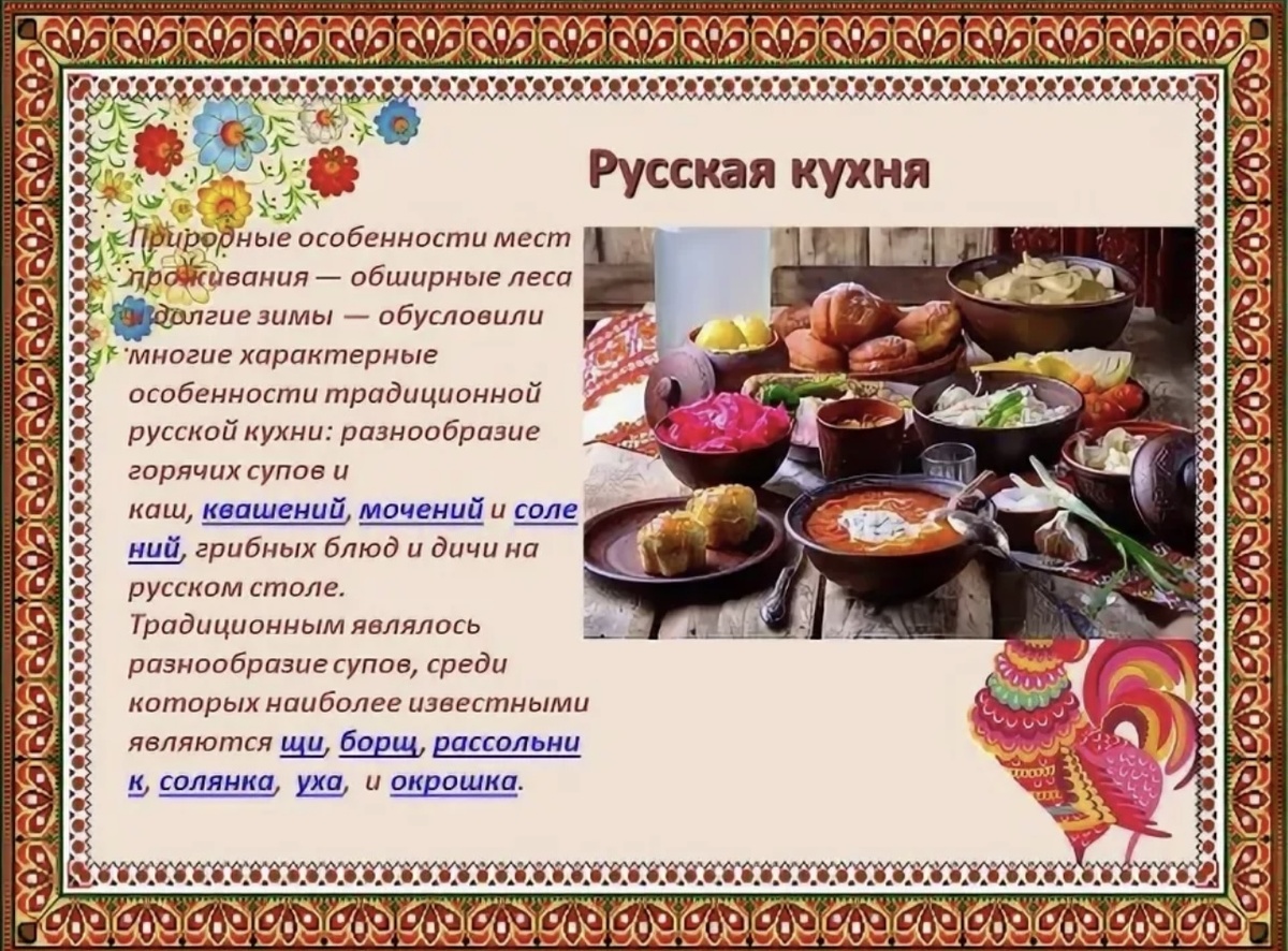 Русская кухня – это богатейшее наследие, формировавшееся веками под влиянием географических, климатических и культурных факторов. Она славится своими сытными и ароматными блюдами, отражающими дух и традиции русского народа. Те кто приезжает в Россию я рекомендую попробовать эти блюда, они очень вкусные! Первым делом это Супы: Занимают особое место в русской кухне. Щи, борщ, рассольник, солянка – лишь малая часть разнообразия. Готовятся на мясном, рыбном или овощном бульоне с добавлением капусты, свеклы, соленых огурцов и других ингредиентов. Отличаются насыщенным вкусом и питательностью. Мои любимые супы которые я бы лично вам посоветовал в первую очередь попробовать это борщ и солянку! Потом бы я порекомендовал вам Каши: Издревле были основой рациона. Гречневая, овсяная, перловая, пшенная – их варили на воде, молоке, с добавлением масла, мяса или овощей. Каши – символ достатка и благополучия. Каша придает силы на весь день, а также хорошо влияет на организм! Потом идут Пироги: Предста