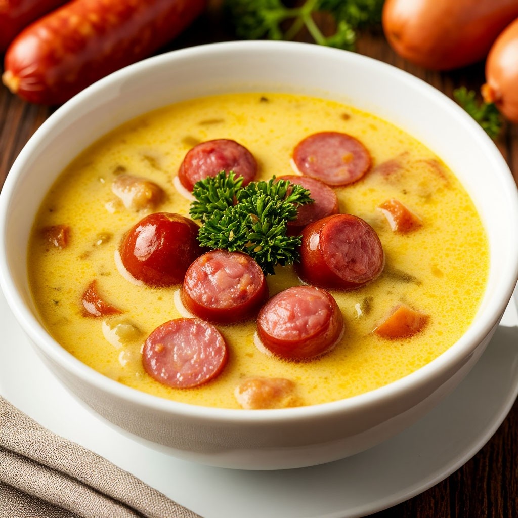 Сливочный суп с охотничьими колбасками – это аппетитное блюдо, которое радует своим насыщенным вкусом, приятным ароматом и согревающей консистенцией. Такой суп особенно хорош в прохладные дни, когда хочется чего-нибудь по-настоящему уютного и сытного. Рассмотрим, какие ингредиенты нам понадобятся и как шаг за шагом приготовить это блюдо. Ингредиенты: Как приготовить: 1. Колбаски режем как нравится, кружочками или кусочками. Картошку чистим и тоже режем кубиками, но не мелкими. Морковку трём на тёрке или шинкуем тоненько. Луковицу мелко-мелко рубим. 2. Берём большую кастрюлю, наливаем туда чуть-чуть масла и греем на среднем огне. Обжариваем лук до золотистого цвета, потом кидаем туда морковку и жарим, пока она не станет мягкой. 3. Теперь добавляем колбаски к овощам и обжариваем, помешивая, до румяной корочки и вкусного запаха. 4. Вливаем в кастрюлю литра полтора-два воды или бульона. Доводим до кипения, кладём картошку, солим и перчим по вкусу. Варим суп на среднем огне минут 1