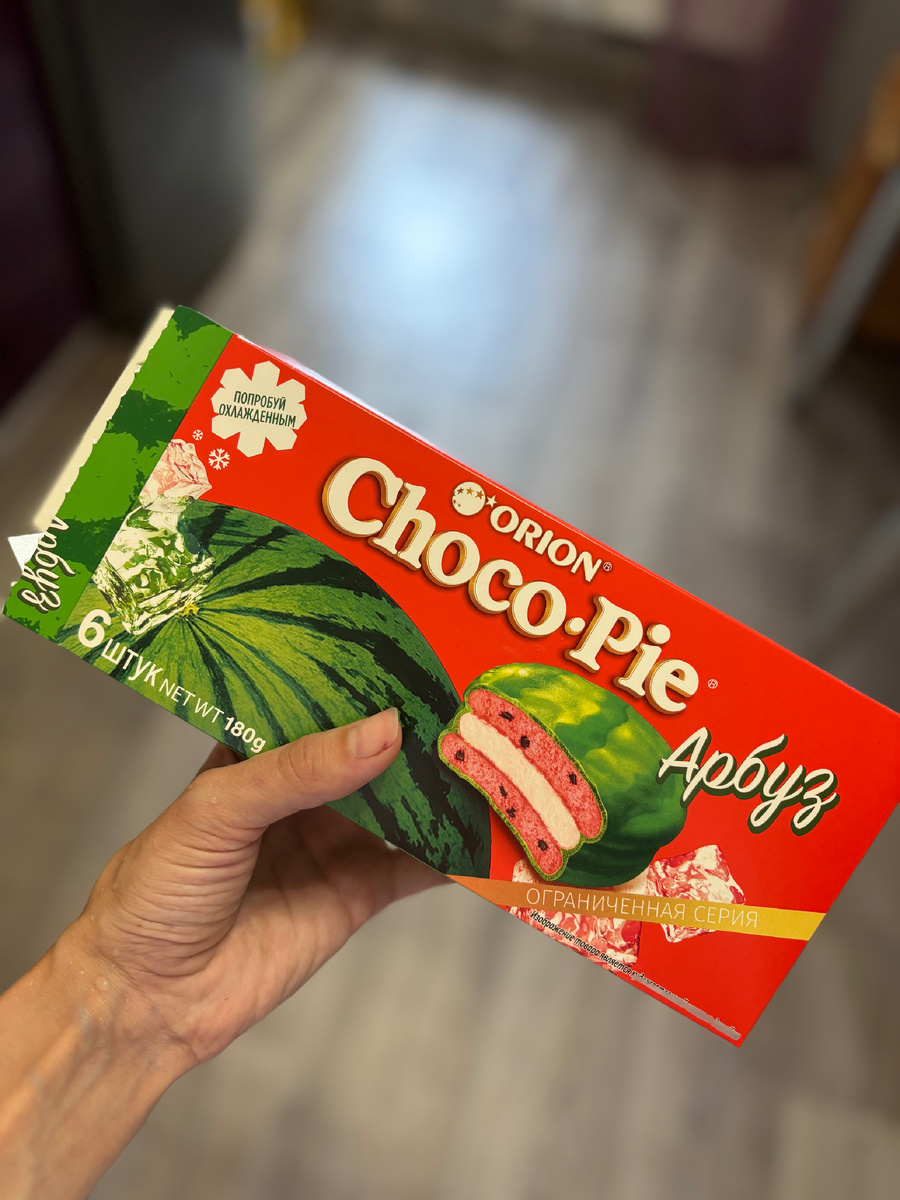 Друзья, наткнулась я годами ранее на арбузный чоко-пай, но он был импортный и стоил как-то неприемлемо для меня…. И вот, захожу я в одну известную федеральную сеть и вижу его🍉 Ну конечно же упаковка печенья быстро отправилась в покупную корзину 😁 Внутри было вот такое печенье 🍪 И знаете что? Мне понравилось😁 Внутри как обычно 2 бисквитных печенья, но они уже розовые и с шоколадными каплями, имитирующие семечки арбуза, по середине суфле. А сверху - тоненький слой зелёной глазури. В меру красителей: собственно по фото внутри видно, по ароматике: аромат и вкус нерезкий. Купила бы я ещё, скорее да 😅 А какой необычный чоко-пай вы ели?