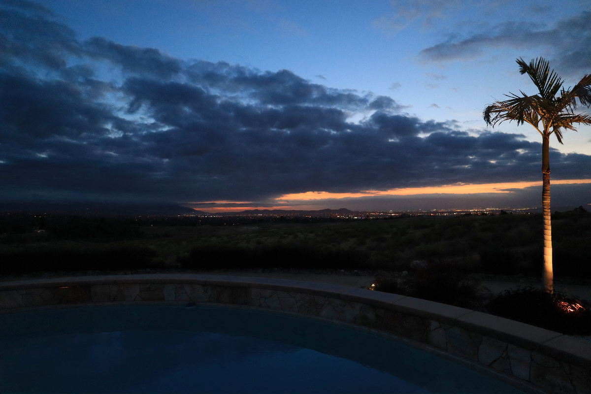 Дом моего друга располагается в месте, с которого открывается прекрасный вид. Особенно он хорош вечером, когда, сидя в джакузи, любуешься закатом и зажигающимися в долине огнями. Сегодня, правда, были тучи, и заката в его полной красе мы не увидели.
