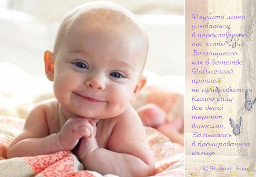 Научите меня улыбаться в перекошенное от злобы лицо Беззащитно, как в детстве, надменной иронией не прикрываться Какую силу все дети теряют взрослея, замыкаясь в бронированное кольцо ~ ~ . . ~ ~ © Натали Лира ~ ~ . . ~ ~ Другие стихи ~ ~ . . ~ ~ * И мгновение Жизни !! * Одуванчик * Случилась небольшая пауза в Пути * Сияют звёзды ярче в темноте... * И обрести покой * Мечта * Мне снились звёзды наяву * Когда судьба идёт тебе навстречу ~ ~ . . ~ ~ ЧТО ЕЩЁ МОЖНО ПОЧИТАТЬ на КАНАЛЕ ~ ~ . . ~ ~