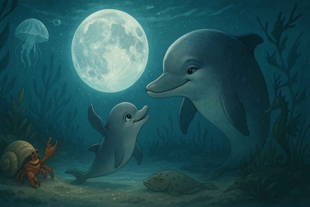 – Солнце – это звезда! – думал Лу, глядя в ночное небо. – Какое красивое слово – звезда! Наверное, поэтому сестричку Зи назвали звездой. Ведь Зи очень красива. Он посмотрел вверх и увидел в небе Луну. – А что такое Луна? – задумался Лу, – может быть Луна –это тоже звезда, только ночная? – Как ты думаешь, – спросил дельфинёнок у Рака–отшельника, – Луна – это ночная звезда? – Луна –это большая ракушка, в которой живёт небесный рак–отшельник, – ответил тот. – Что ты! – возразила подплывшая медуза аурелия. – Луна – это большая небесная медуза, потому что она светится, как и мы. – Луна – самая большая небесная камбала, – вступила в спор камбала, выплывшая из-под песка, – разве вы не видите, что она покрыта пятнами, как мы. Морской дракон фыркнул, но на этот раз промолчал. – Мама, что такое Луна? –спросил дельфиненок у Ма, которая была рядом с ним и с улыбкой слушала разговор. – Луна – это спутник Земли. – А что такое спутник? – Спутник – это тот, кто всегда рядом. Луна кружится вокруг Зем