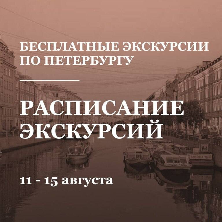 Друзья, расписание на эту неделю⤵️ 🚶🏻➡️ПЕШИЕ ЭКСКУРСИИ: 📥11 августа (понедельник) ⭐️Бесплатные: 11:30 — 13:00 "Буду счастья искать я в тревожном, больном. Красоты и греха ощущенье двойном…" 15:00 — 17:00 "Офицерская улица. От Театральной площади до Пряжки...." 17:00 — 19:00 "Не в рюмочной на Моховой" 💰 Платные: 20:00 — 21:00 Онлайн-практикум "Уверенный голос экскурсовода" 📥12 августа (вторник) ⭐️Бесплатные: 12:00 — 13:30 "Про́клятые фавориты и потерянная столица: тайны первых лет Петербурга" 13:00 — 15:00 "По тихим улочкам Коломны..." Часть 2 13:00 — 14:30 "Пешком по Северной Европе, или лютеранский квартал в Петербурге" 17:00 — 18:30 "Поэма «Медный всадник»: по следам стихии" 19:00 — 20:40 "Улица Большая Конюшенная – знакомая и такая неожиданная" 💰Платные: 15:00 — 16:30 "Музей-квартира семьи Бенуа (с мини-концертом на арфе)" 📥13 августа (среда) ⭐️Бесплатные: 11:00 — 13:15 "Спор с судьбой: по Загородному, по Разъезжей — к Владимирскому собору" с подъемом на колокольню и эк