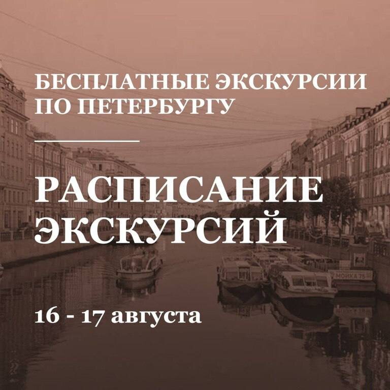 Друзья, расписание экскурсий (продолжение)⤵️ 🚶🏻➡️ПЕШИЕ ЭКСКУРСИИ: 📥16 августа (суббота) ⭐️Бесплатные: 10:30 — 11:50 "Полуденный выстрел. Прогулка по Петропавловской крепости" 11:30 — 13:30 "Нескучные истории парадного Петербурга" 11:30 — 13:00 "Ах, Александры, если б вы смогли! Часть 1. Благие намерения" 12:00 — 14:00 "Канал Грибоедова (Там, где протекала речка Кривуша)" 12:00 — 13:45 "По волнам истории: от Волынкиной деревни до Гутуевского острова вдоль реки Екатерингофка" 12:00 — 14:00 Премьера! "Угловой жилец или золотой треугольник Достоевского" 12:00 — 13:30 "Как стать миллионером и закончить жизнь в чемодане" 13:00 — 14:30 Премьера! "Уголок здоровья. От Петровских времен до наших дней" 14:00 — 15:30 "Русские масоны. Тайны Петербургских особняков" 14:00 — 16:00 "Последний реформатор. Петербург Столыпина" 15:00 — 16:30 "Большая Миллионная… Атланты, бароны, поэты, матроны…" 15:15 — 17:15 "Исаакиевский собор — северное чудо Монферрана" 16:00 — 17:45 "Прогулка по земляному валу