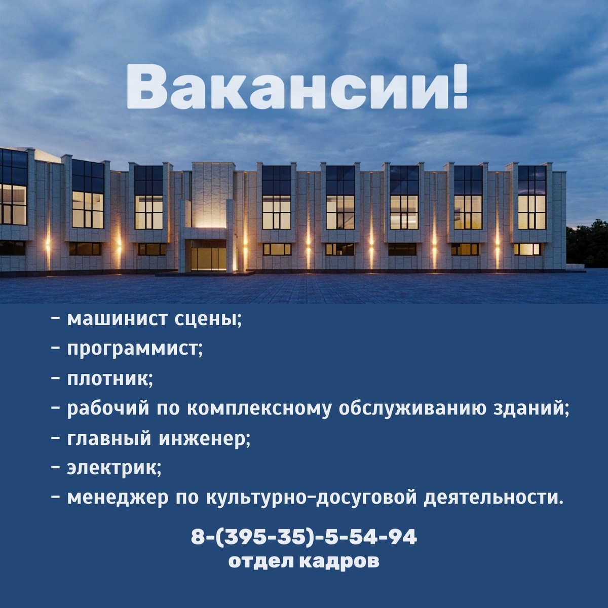 Во Дворце культуры “Дружба” есть вакансии: ➡️ машинист сцены; ➡️ программист; ➡️ плотник; ➡️ рабочий по комплексному обслуживанию зданий; ➡️ главный инженер; ➡️ электрик; ➡️ менеджер по культурно-досуговой деятельности. Обращаться в отдел кадров: 8-(395-35)-5-54-94.