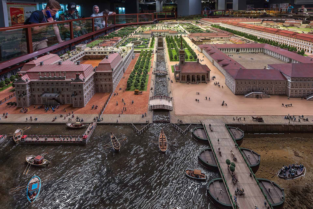 Маленькие суденышки с размахивающими парусами, точные до мельчайших деталей копии известных судов XVIII века, плывут по поверхности акватории. Причалы и набережные, словно ожившие по приказу времени, наполняют всю композицию движением. Детали — от деревянных причалов до миниатюрных фигур в одежде того времени — создают ощущение, что вы переноситесь в эпоху Петра, когда стиль и техника следили за каждым движением ветра, а Петербург был венцом импери