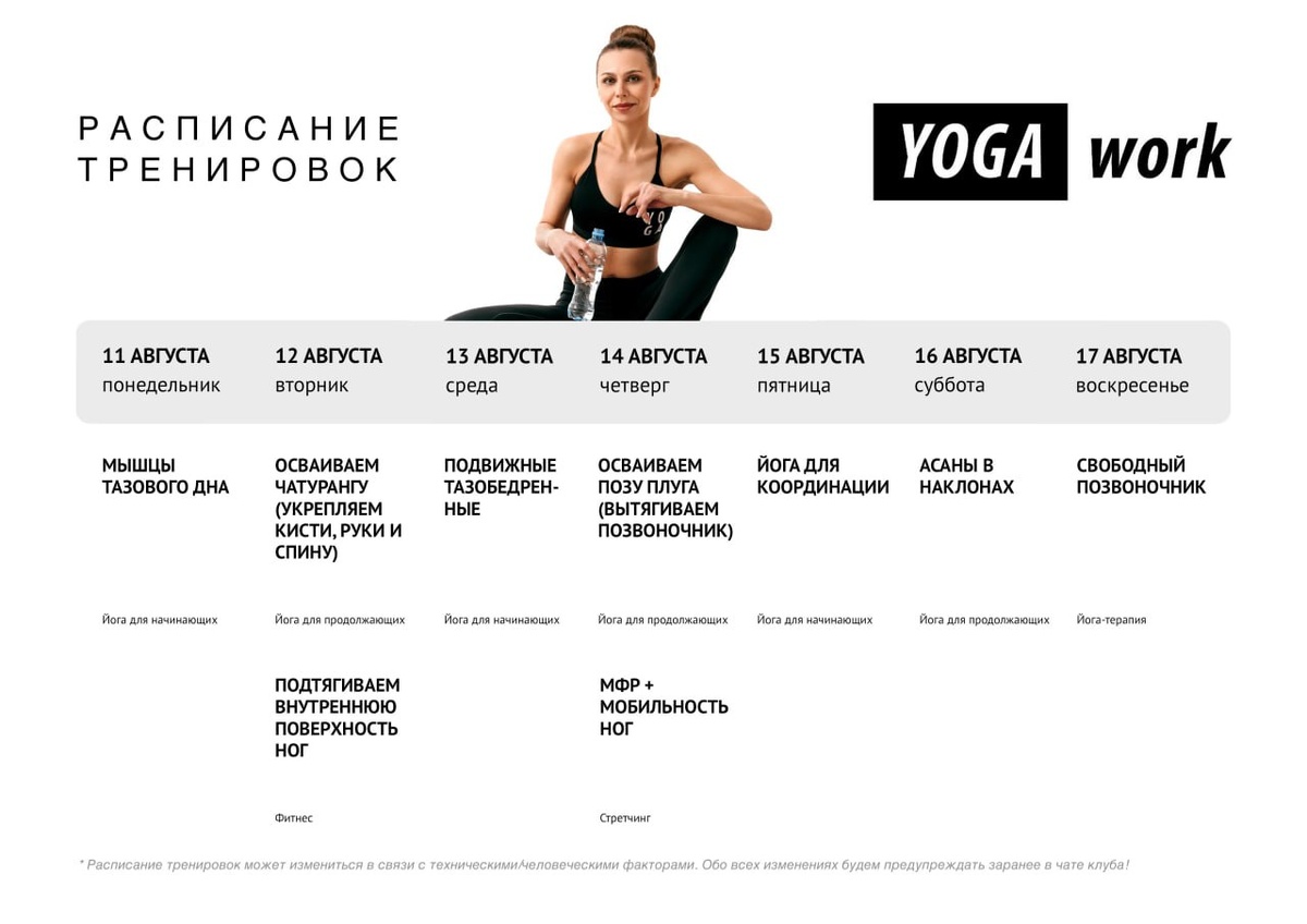 🧩 Личный пазл здоровья: каждый день — кусочек нового состояния На этой неделе в закрытом клубе YOGA work мы собираем систему — из силы, мягкости, баланса и дыхания. Каждое занятие, как шаг к здоровому телу. А вот что у нас по расписанию: ✔️ Понедельник — мышцы тазового дна (для начинающих) Те самые мышцы, которые никто не видит, но от которых зависит почти всё: осанка, женское и мужское здоровье, легкость в теле, здоровье поясницы. Мужчины, вы тоже не пропускайте! ✔️ Вторник — осваиваем Чатурангу (для продолжающих) Чатуранга — основа йогической силы. Если хочется перестать падать грудью в коврик и начать держать себя с достоинством — вы по адресу. Разбираем асану по кирпичикам: где руки, где плечи, куда смотреть, чем дышать ❤️ Фитнес — подтягиваем внутреннюю поверхность ног ✔️ Среда — подвижные тазобедренные (для начинающих) Если таз залип — страдает вся система: поясница ноет, походка теряет грацию, в теле тяжесть. Будем бережно размораживать это место: раскрепощать, растягивать