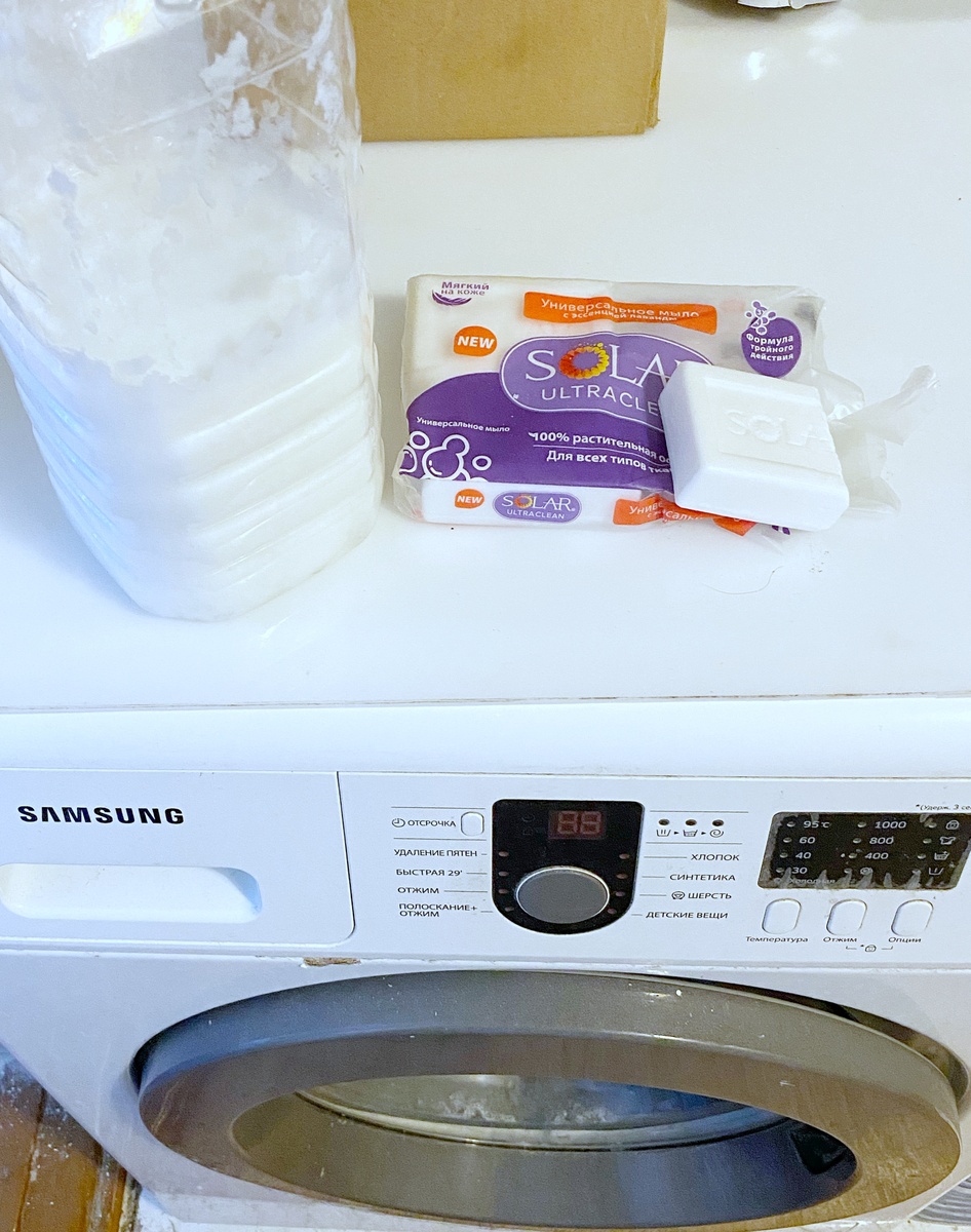 Всем доброго дня! Продолжаю тему экономии средств, кому эта тема нравится, приглашаю вас к прочтению моей статьи. Еще раз уточню, что это лишь мой опыт. Кому нравится мой подход, может присоединиться. Иногда такие простые вещи делают люди, что ты думаешь, ну как я сама до этого не додумалась 🤪. Итак, сегодня попробую раскрыть некоторые мои находки. В предыдущей статье я писала, что перешла на гели для стирки собственного изготовления. Расскажу, как я готовлю гель. Последние два раза делала его из турецкого хозяйственного мыла (оно на фото) с лавандой. Я делаю за раз 2,5 литра. Мне так удобно. Хранить проще такой объем, и не занимает много места. Так вот, возвращаюсь к рецепту: на 2,5 литра готового геля нужно всего лишь 50 грамм хозяйственного мыла. Можно использовать ваше любимое, проверенное мыло. Я так и делаю, к турецкому мылу добавляю нашего хозяйственного мыла. Мыло тру на терке. Для этого выделила специальную посуду: старенькую кастрюлю на 2,5 литра, старенькую терку, ложку, в