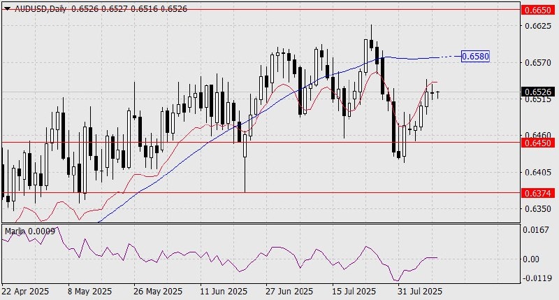 Австралийский доллар достиг индикаторную линию баланса дневного масштаба, начал консолидацию, осциллятор Марлин к этому времени перешёл в