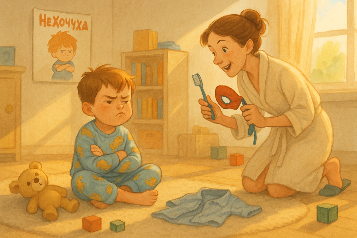 — Не хочу вставать! Не хочу умываться! Не хочу одеваться! Каждое утро в доме звучит маленький манифест «Нехочухи» — как в том самом советском мультфильме, только вместо героя с экрана перед вами сидит ваш собственный ребенок, вполне реальный. Но у родителей есть секретное оружие — игра. Она способна превратить утренние протесты в весёлое приключение, а «не хочу» — в «давай сам!». Утро: игра “Супергерой” Превратите каждое утреннее действие — умывание, одевание — в подготовку к важной миссии. Ребёнок — Супергерой, который всегда всё делает сам. Можно подарить ему маленькую шапочку или маску Супергероя, которую он надевает на «миссии». Музыкальная уборка Ребёнок становится волшебным сортировщиком. Дайте ему накидку или фартук, поставьте весёлую песенку и предложите собрать игрушки до конца трека. Музыка добавит азарт, а костюм — чувство значимости. Выбор одежды: телепередача “Модный показ” Пусть ребёнок сам выберет, что надеть, и устроит показ мод: «великолепный костюм для приключ