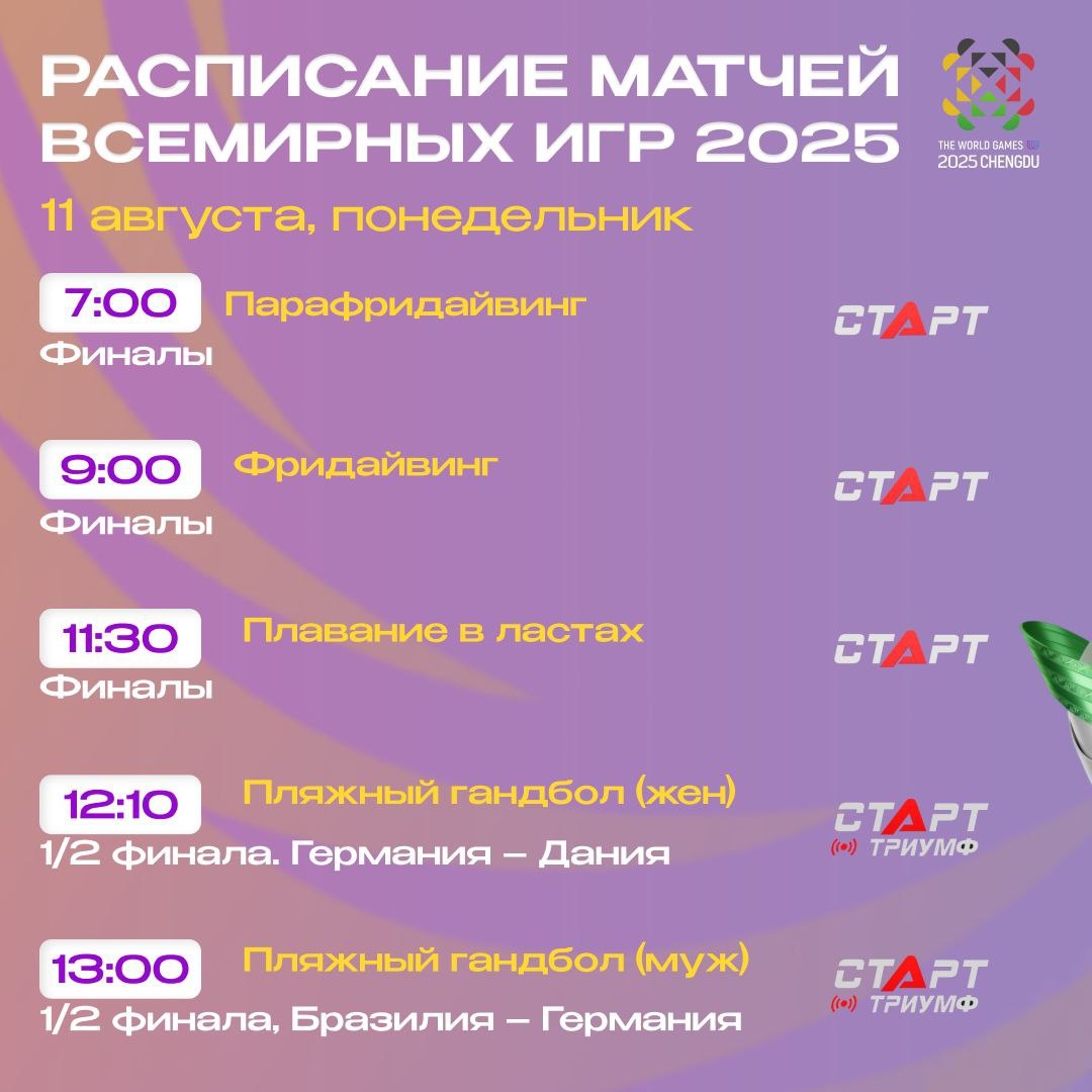 🍿📺 Четвёртый день Всемирных Игр! Как и вчера, начинаем с дайверов. Вслед за ними в бассейне выступят пловцы в ластах. Обе дисциплины вчера нам принесли медали, чего ждём сегодня? Из командных видов спорта смотрим флорбол, пляжный гандбол, лакросс и инлайн-хоккей, где вместо коньков ролики. Для любителей единоборств – полуфиналы в ушу саньда. Следим за Играми в Чэнду вместе на телеканалах «Старт» и платформе TVSTART.RU 🖥 🛒 Наше приложение в Google Play 💙 Наше приложение в RuStore 🛒 Наше приложение в App Store