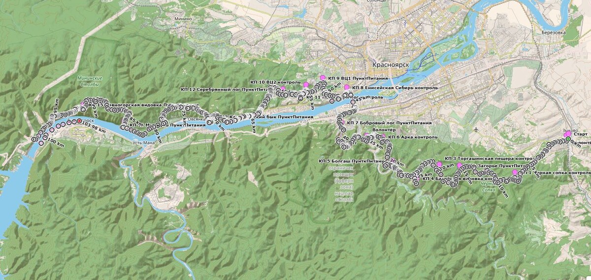 Напомним, маршрут Большой Енисейской тропы составляет более 100 км. Она начинается в Зыково, проходит через Базаиху и Бобровый Лог. Далее по Николаевскому мосту тропа идёт к Гремячей гриве, Серебряному логу и Караульненскму нагорью. 81-й километр отмечен в Минжуле, далее путь идёт к Дивногорской видовке и началу Мининских столбов. По мосту возле ГЭС тропа приходит в Дивногорск, здесь его финальная точка.