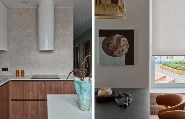 Стильный гарнитур, креативные решения и максимум пользы даже при ограничениях Эта кухня — яркий пример того, как стандартную отделку от застройщика можно превратить в дизайнерское пространство. Без глобальных перепланировок и с ограничениями на изменения команда смогла создать атмосферу комфорта, уюта и функциональности, которая отвечает потребностям молодой пары и их кота. На кухне объединились строгость архитектурной геометрии и тактильность натуральных материалов. Верхние фасады матовые, гладкие, без ручек, часть окрашена в белый цвет и практически сливается со стеной. Нижние шкафы, наоборот, выделяются: они облицованы шпоном темного дерева с выразительным вертикальным рисунком, что добавляет глубины. Для отделки фартука и стен использовали керамогранит с деликатным рисунком камня: материал выбран не только из-за прочности и влагостойкости, но и используется как элемент архитектурной связи — те же плиты продолжаются в зоне прихожей, объединяя два пространства в единый визуальный кон