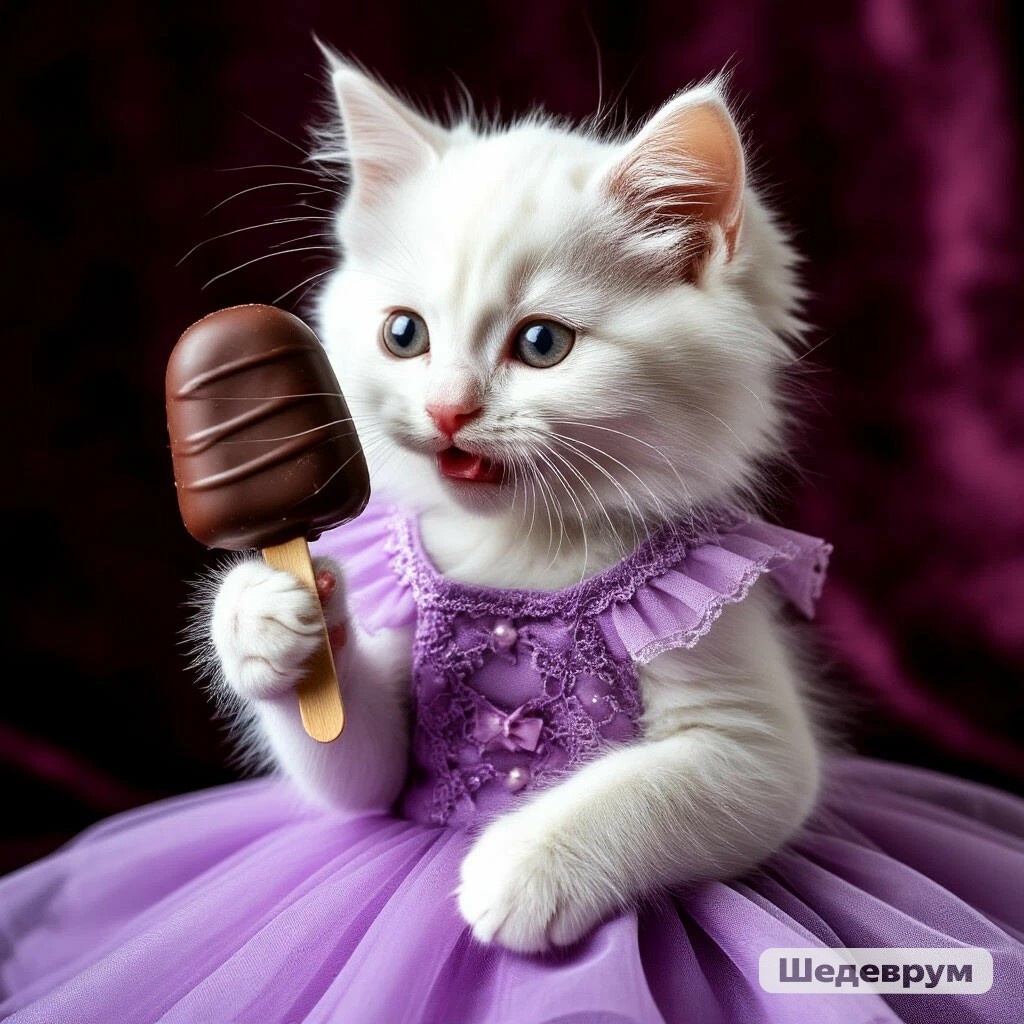 Доброго времени суток, уважаемые читатели! Погода в Мурманске бросается из одной крайности в другую. Первую половину лета мы замерзали, теперь изнываем от жары, которая порой доходила до 29°. И хотя сейчас немного похолодало, дома всё ещё жарко – выше 25°. Плиту включаю только по утрам. Вечером на кухню стараюсь не заходить. Окна ориентированы на запад, и солнце с 18 до 21 часа раскаляет кухню до 28°. Спасаюсь мороженым. Не успеваю покупать. Поскольку делать в такую жару ничего не хочется, валяюсь на диване и осваиваю приложение "Шедеврум". Оно бесплатное. Видео там очень короткие – 4 секунды. А вот фотки получаются неплохие. Но далеко не с первого раза. Не так давно, пытаясь сделать поздравление одному из моих читателей с Днём железнодорожника, столкнулась с тем, что ИИ не знает, как выглядит российская форма, и выдаёт мне совершенно невообразимые варианты. Промучившись с полчаса, оставляю эту затею. Пусть котик будет "голым", но с шампанским в лапках. Тут меня тоже ждало несколько сю