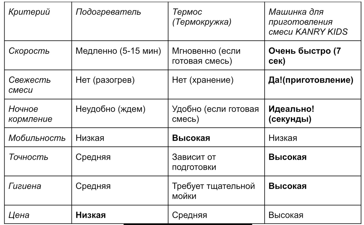 Однако, для максимального комфорта, скорости и безопасности именно дома, лидером однозначно становится умная машинка для приготовления смеси KANRY KIDS. Она превращают самый стрессовый процесс ночного кормления в одну кнопку и 7 секунд ожидания. Это не просто гаджет, это инвестиция в спокойный сон всей семьи и уверенность в свежести и правильности приготовления питания для малыша.