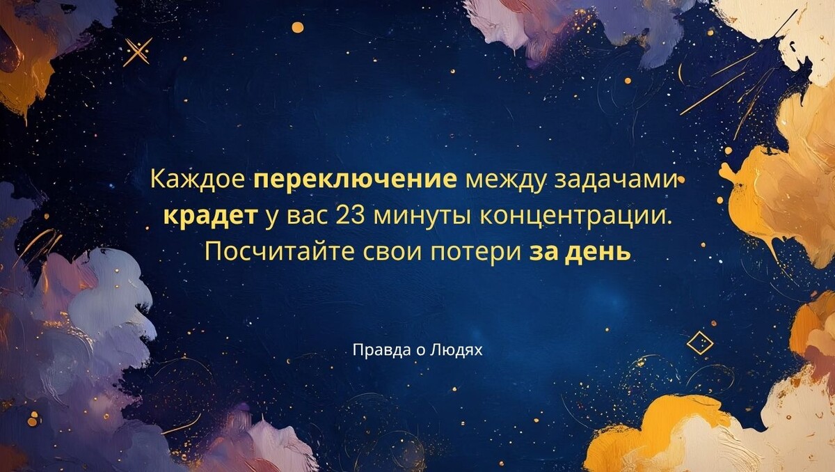 Человеческий мозг физически не способен выполнять несколько сложных задач одновременно. То, что мы называем многозадачностью, на самом деле является быстрым переключением внимания между задачами. И каждое такое переключение стоит нам дорого.