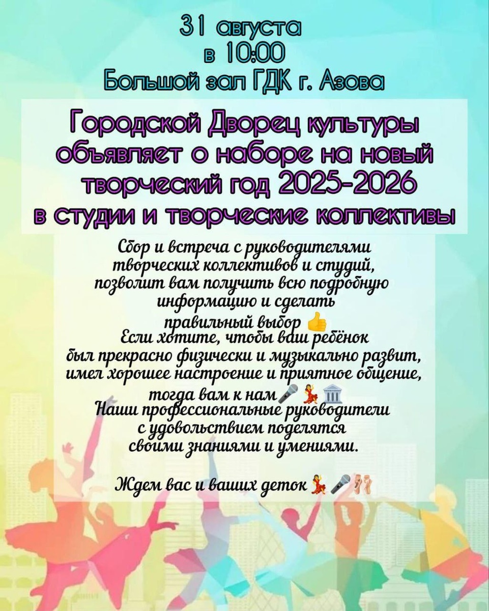 🎭 Двери творчества открываются! Набор в коллективы ГДК Азова на 2025-2026 год 📅 31 августа в 10:00 📍 Большой зал Городского Дворца культуры (г. Азов) Детей и их родителей приглашают на День открытых дверей! Встреча с руководителями творческих студий поможет выбрать направление по душе. ### ✨ Почему стоит присоединиться? - 🎤 Вокальные и театральные студии - 💃 Танцевальные коллективы (от классики до современных направлений) - 🎨 Художественные и прикладные мастерские - 🎭 Развитие творческих способностей в дружеской атмосфере ### 🎯 Преимущества: ✅ Профессиональные педагоги с большим опытом работы ✅ Комфортные условия для творческого роста ✅ Участие в конкурсах и концертах 💬 "Творчество — это не только навыки, но и радость, уверенность в себе и новые друзья!" #ГДКАзов #Творчество #Набор2025 #ДетиАзова 👉Подписаться на канал "АН"❗️