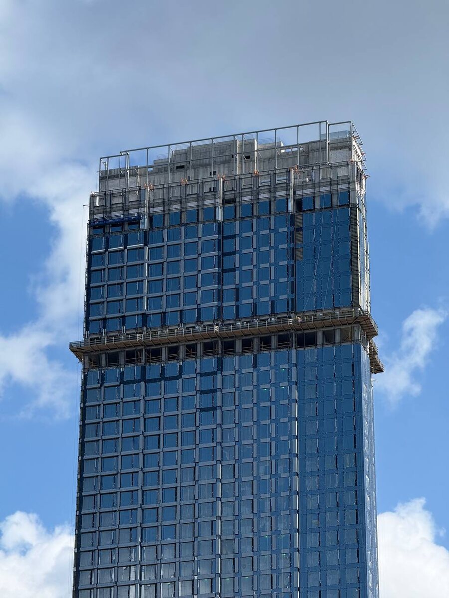». Напомним, что недавно, после 4-месячного перерыва, здесь были возобновлены работы по монтажу светопрозрачных конструкций. К настоящему моменту до полного закрытия наружных площадей здания остаётся выполнить порядка 10% работ от всего запланированного объёма. #апсайдтауэрс 😊 Небоскрёбы России