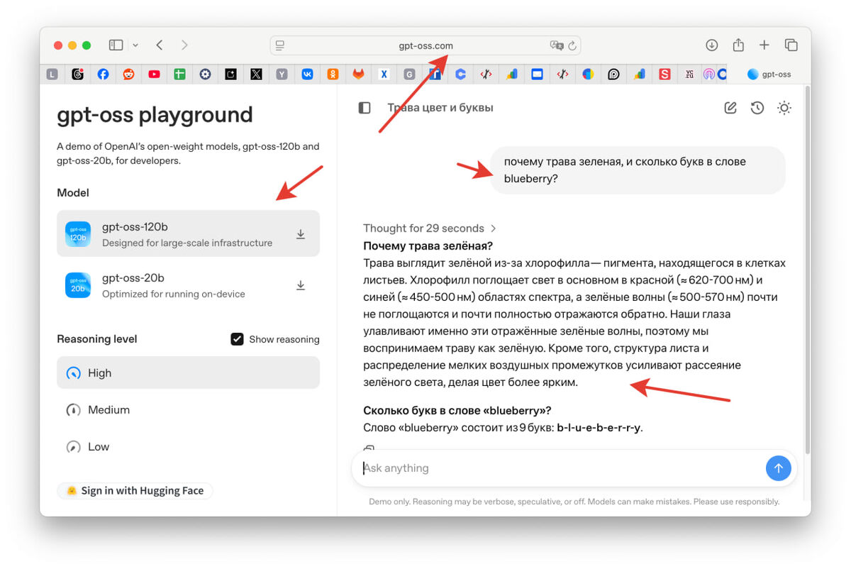 Вот на этом сайте (подсветил) можете бесплатно и не быстро поиграться с новой открытой моделью GPT-OSS-120b и понять подойдет ли она вам или