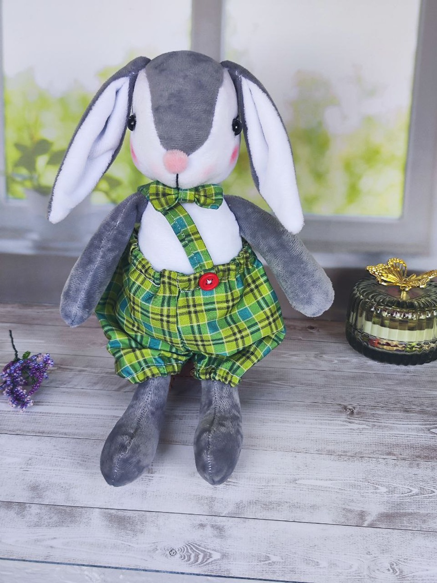 Я дошила зайчика друга для своего олененка девочки. Он хоть и маленький но зато такой милый очаровашка. Это пока он в штанишки но потом еще приобретет в гардероб себе комбинезончик
