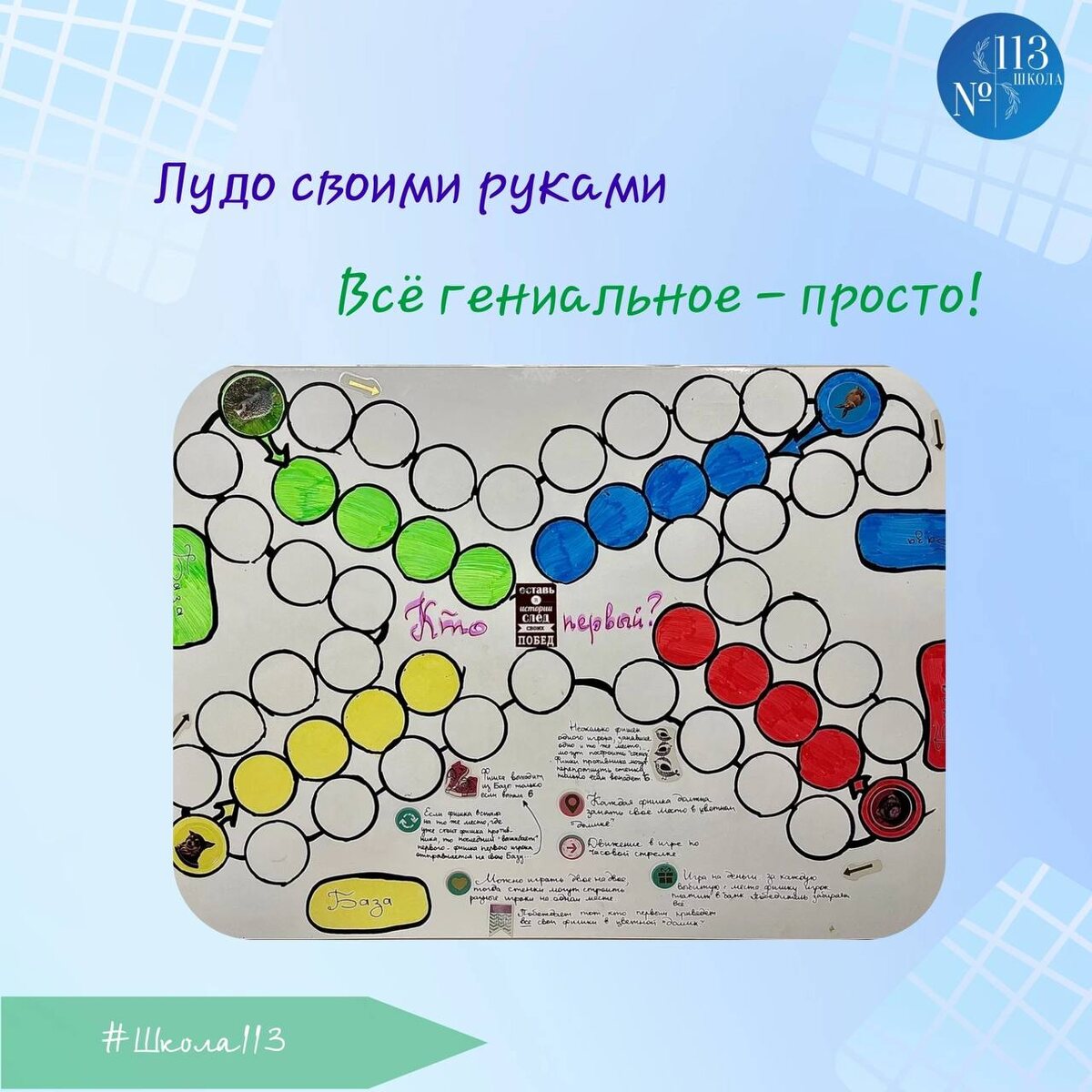 Сегодня наш учитель-логопед, педагог-библиотекарь Наталия Владимировна Туба, расскажет про интересную игру, в которую можно играть, как с друзьями, так и всей семьей. 🗯 Всё гениальное – просто! Этому правилу целиком соответствует одна из известнейших настольных игр под названием… «Кто первый?», «Приятель, не сердись!», «Балда», «Тише! Тише!» - сколько на самом деле названий у этой «ходилки» - никто не знает. Пачиси появилась около 4000 лет назад в Индии, где до сих пор считается национальной игрой. Позже, в 1896 году игру запатентовали в Англии как Лудо, откуда она разошлась по всей Европе. ✏ Сегодня лудо можно купить самого разного оформления и качества – от тонкой картонки до деревянных подарочных изданий. А можно сделать такую игру своими руками, как когда-то в СССР её рисовали наши родители. 🎨 Игровое поле устроено элементарно: маршрут ходилки в виде креста с цветными полями-домиками для фишек-колпачков соответствующих цветов. Если склеить по длинной стороне два листа А´4 и вз