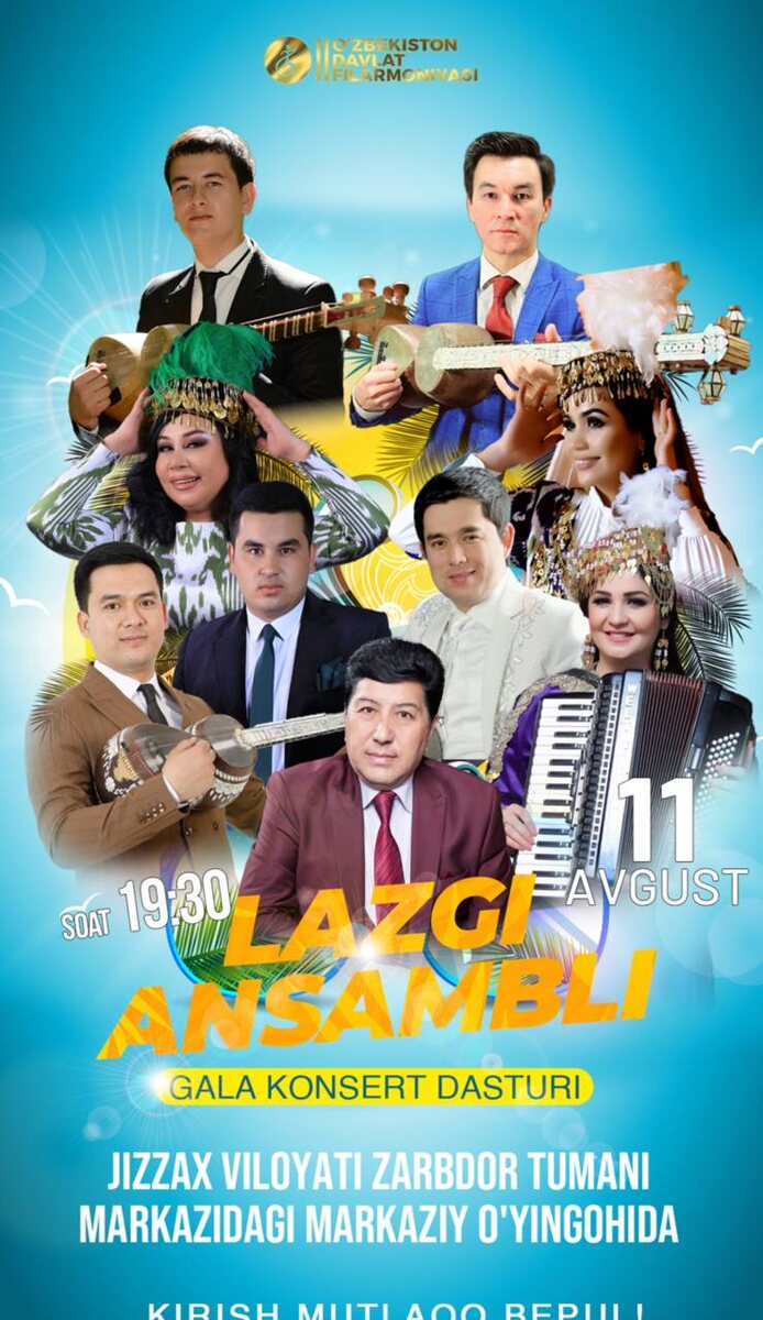 Хоразм санъати ихлосмандлари диққатига Бугун “Лазги” ансамблининг галаконцерти Жиззахда 📍Зарбдор туман марказий ўйингоҳи ⏰11 август 19:30 👛Кириш бепул Каналимизга обуна бўлинг ва энг сўнгги янгиликларни кузатиб боринг Jizzaxnews |Тelegram | Facebook | Dzen | YouTubе