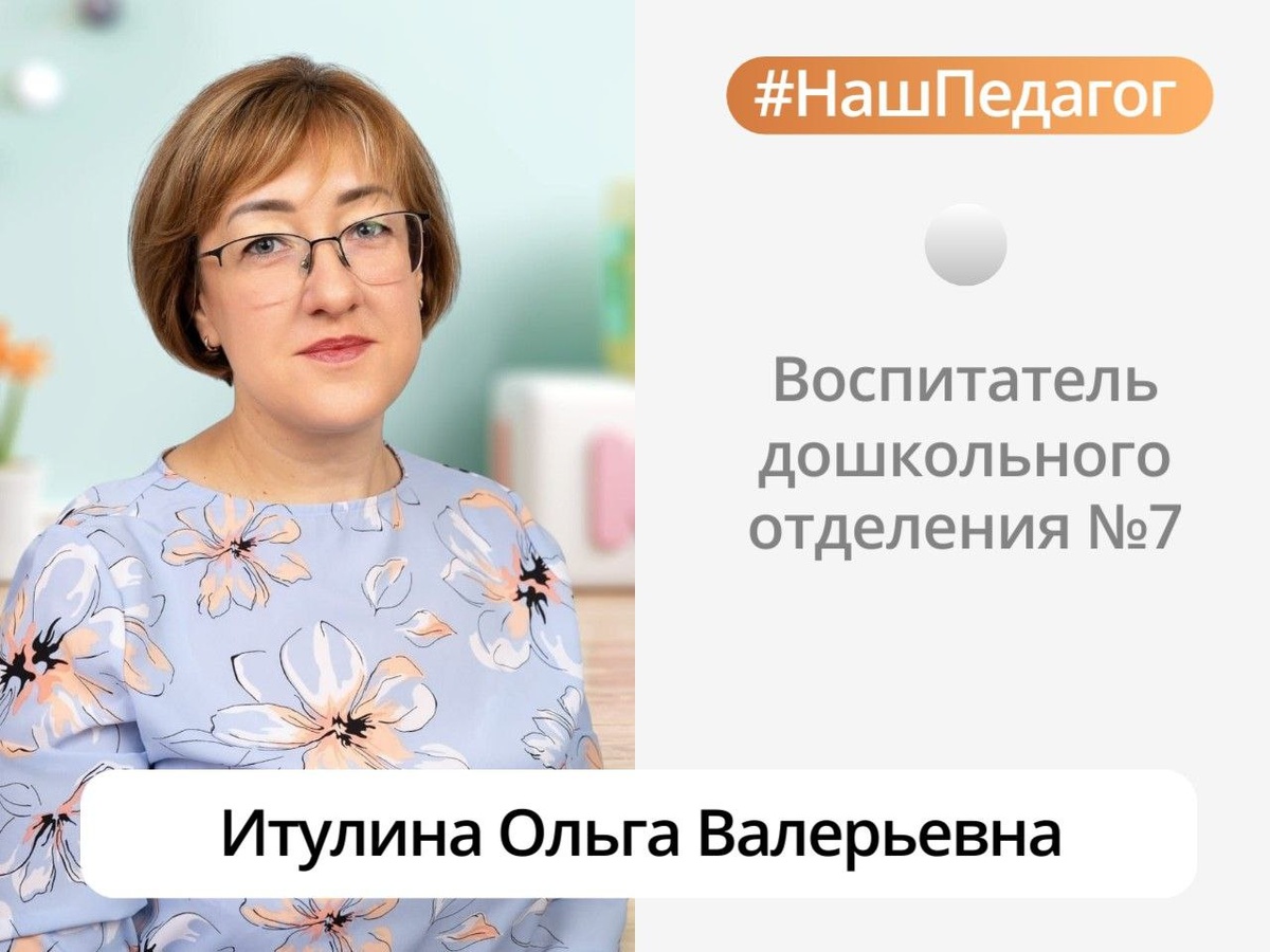 Наш воспитатель Итулина Ольга Валерьевна любит свою работу и искренне верит в каждого ребенка. Она знает, что каждый воспитанник способен на многое, и ее задача – помочь ему раскрыть свой потенциал и стать успешным человеком. Давайте знакомиться! 🗣️Я — воспитатель-практик с творческим подходом и убеждением: "Я не знаю, куда уходит детство, но я точно знаю, где в него играют!" 🗣️Стандартные занятия? Нет, это не про меня! Вместо этого — идеи для развития творческого мышления, нестандартные игры, увлекательные эксперименты и познавательные занятия. 🗣️Верю в каждого ребенка, его силы, уникальность, инициативу, ценю его идеи, самостоятельность, смелость пробовать и ошибаться. 🗣️В своей работе я применяю ТРИЗ-технологии и проектную деятельность, чтобы вдохновлять детей на творчество, открытие нового и развитие талантов. 🗣️В свободное время люблю вязать и рисовать. 🗣️Для меня главное — видеть интерес в глазах детей и поддерживать их стремление к познанию. 🗣️Современным детям