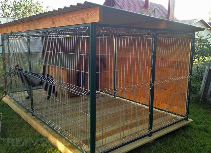 Выбор ограждения зависит от массивности и агрессивности питомца. Спокойным воспитанным собакам вполне подойдёт арматурная сетка или рабица, но для качественного натяжения придётся добавить несколько вертикальных арматурных прутьев через 100–140 см. Для крупных агрессивных собак лучше сделать изгородь целиком из вертикальных арматурных прутьев. Расстояние между ними должно быть таким, чтобы собака не могла полностью просунуть голову, иначе в определённый момент она может элементарно застрять в ограждении. Чтобы прутья нельзя было раздвинуть, их рекомендуется стянуть между собой одной-двумя горизонтальными линиями арматуры.