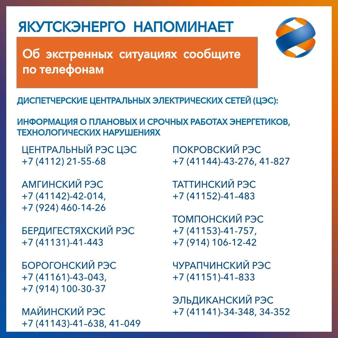 Если обнаружили оборванный провод В связи с неблагоприятными погодными условиями, участившимися дождями и грозами энергетики ПАО «Якутскэнерго» обращаются к жителям Якутии. Уважаемые якутяне! Находясь в черте города, на частном секторе, на территориях дачных кооперативов, на природе, в сельских населенных пунктах, летниках, обращайте внимание на состояние опор и проводов линий электропередачи во избежание случаев электротравматизма и несчастных случаев. В случае обнаружения свисающего, лежащего на земле или искрящегося провода или его обрыва ни в коем случае не приближайтесь к нему на расстояние ближе 8 метров (20 шагов)! Подробнее: https://xn--80aaaaaqpp6as1cq2a.xn--p1ai/yakutskenergo-napominaet-kuda-obrashhatsya-i-chto-delat-esli-obnaruzhili-oborvannyj-provod/ Пресс-служба Центральных электрических сетей ПАО «Якутскэнерго @Новости газеты «Хангалас»