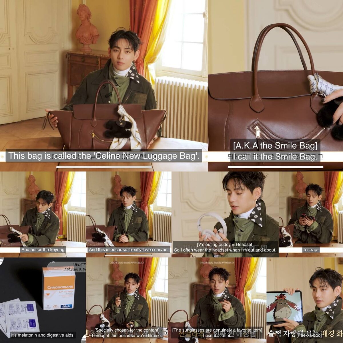 🔮 Что в сумке у Ви из BTS. Тэхён: Эта сумка называется "Celine New Luggage Bag", я называю её "Smile Bag" (сумка улыбка). 1. Брелок. 2. Шарфы. 3. Наушники Beats Studio Pro. 4. Ремень Versa Gripps Xtreme. 5. Лекарства: мелатонин и средства для пищеварения. 6. Солнцезащитные очки и парфюм Celine. 7. Apple iPad Pro. cr.kth_facts #V @kumihobts