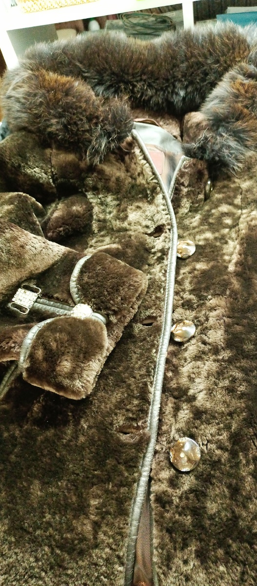 Принесли в ремонт шубку,старенькая,но любимая. Вся шуба отделана кожей. Естественно,за многолетнюю эксплуатацию ,кожа потрескалась и стала обшаркиваться ,в особо трущихся местах. Это борта,карманы, петли ,кант по низу и на рукавах. Делать замену всей кожи нерентабельно,дорого получится. Делаю только самое необходимое. Сделаю новый кант на бортах и на манжетах. Остальное я аккуратно покрасила,там только трещинки были. И снова неожиданные находки! Вы видите на фото,что кожа на отделке коричневая. А я обнаружила остатки бронзовой краски! И при распарывании планки петель вытащила бронзовые! Неожиданно,однако . Еще обнаружила,что петли нуждаются в реставрации и под пуговицами лысины. Вырезаю и заменяю на новый мех. Кусочек меха вырезала из внутреннего капюшона. В капюшон поставила другой кусок,что нашла у себя в закромах. Кожаный кант пришила просто сверху . Манжеты тоже с новым кантом. Не так уж сильно отличается новая кожа от старой. Еще попробую уговорить к