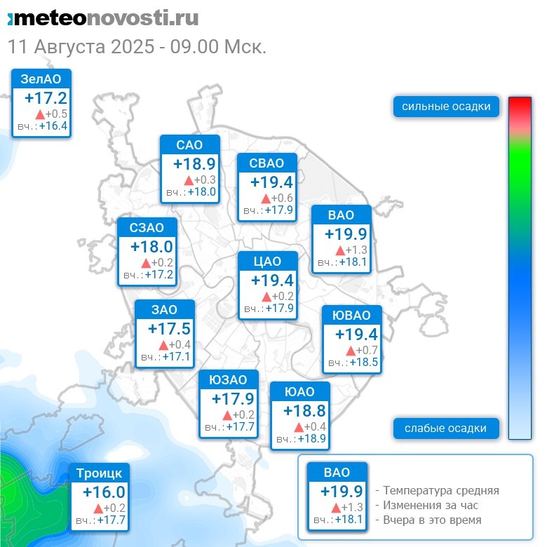 В 9:00 в Москве было от +16.1°C до +20.2°C, средняя температура +18.7°C #погода #Москва #лето #температура #11августа #понедельник