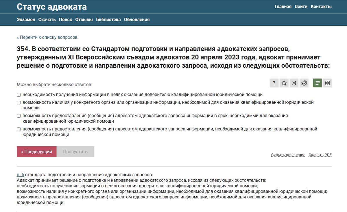 354. В соответствии со Стандартом подготовки и направления адвокатских запросов, утвержденным XI Всероссийским съездом адвокатов 20 апреля 2023 года, адвокат принимает решение о подготовке и направлении адвокатского запроса, исходя из следующих обстоятельств: ----------- Можно выбрать несколько ответов ? ------- п. 5 стандарта подготовки и направления адвокатских запросов