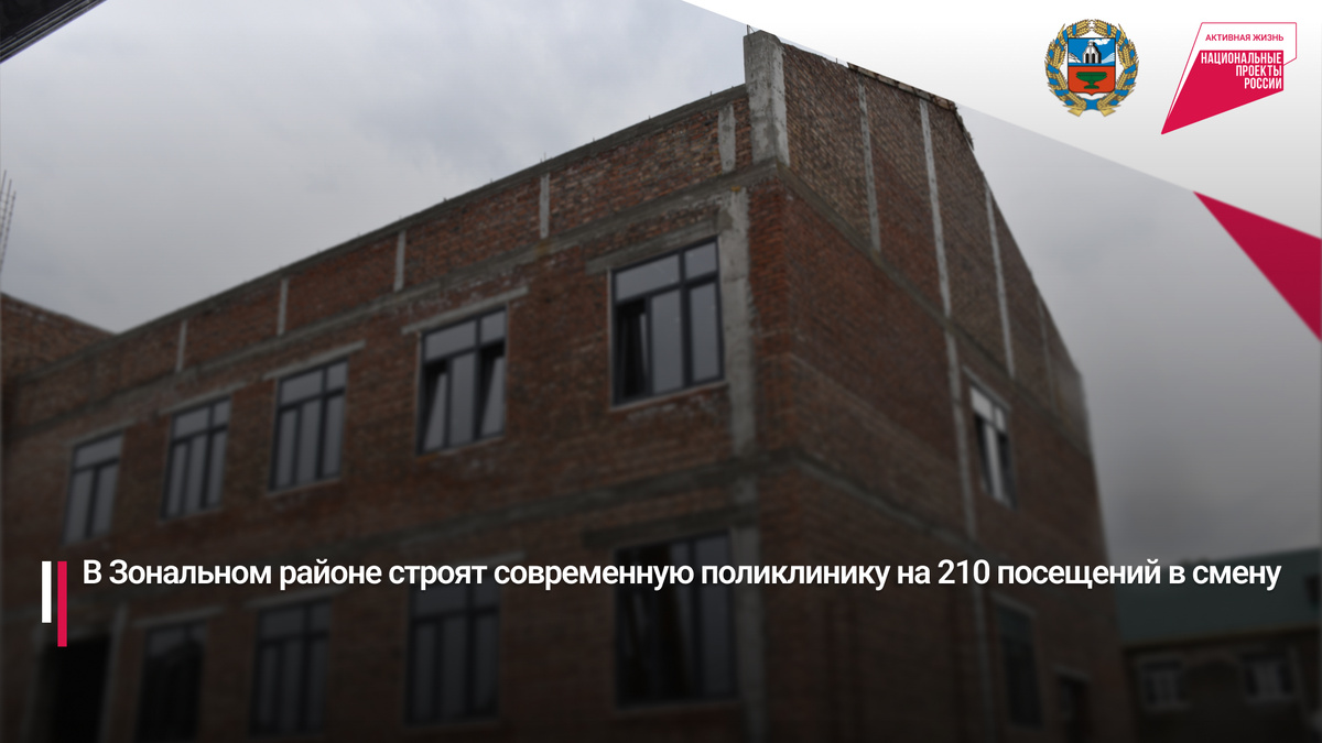 В Зональном районе Алтайского края продолжается строительство новой поликлиники, рассчитанной на 210 посещений в смену. Объект возводится по федеральному проекту «Модернизация первичного звена здравоохранения» в рамках нацпроекта «Продолжительная и активная жизнь».