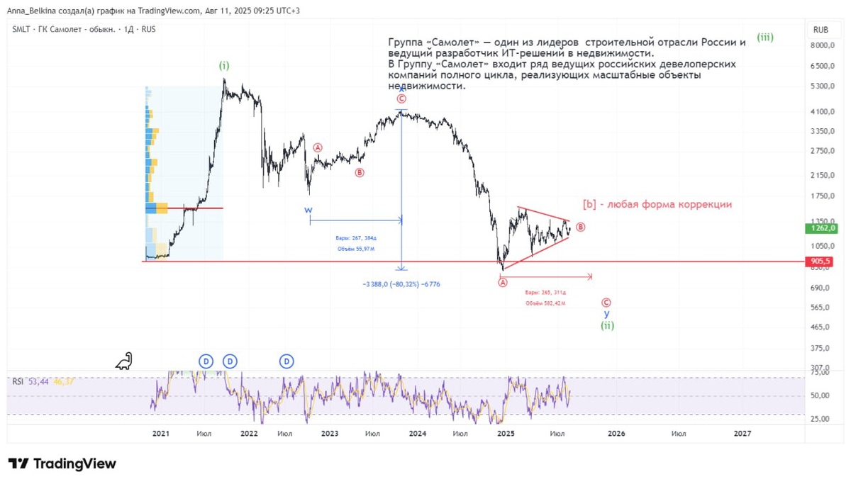 #Застройщики #SMLT Умер основатель строительной компании «Самолет» – Михаил Кенин. Кенин являлся самым крупным акционером компании с долей 29.12%. Оценочная стоимость «Самолета» на конце 2024 составляла ₽873 млрд. Долгое время Кенин не мог продать свою долю в компании. В воскресенье вышла новость о его смерти, ему было 56 лет. Акции реагируют негативно. Обновление технической картины рассматривали в обзоре по застройщикам, 4 августа. https://dzen.ru/media/id/65b8789ff12bfe0796a26941/video-6890efc192170b03870992a7 На старшей картине предполагаю формирование коррекционной волны [b] of y of (ii). Она может принять любой вид коррекции, на графике отмечен треугольник. Важно, чтобы волна [b] of y of (ii) по продолжительности развития не превысила волну х of (ii). Далее ожидаю продолжение снижения в волне у of (ii) на завершение нисходящей структуры. Не является ИИР ☄️ Сейчас действует промокод Август2025 на 25% скидку на любой тариф закрытого канала до 18 августа, включительно. 💪